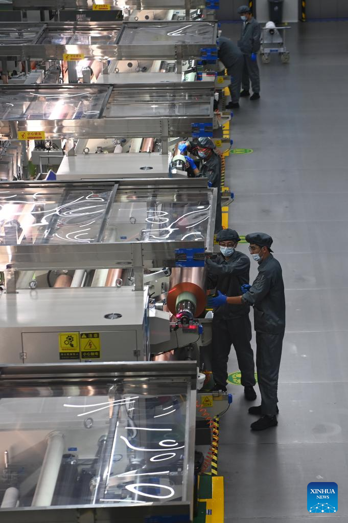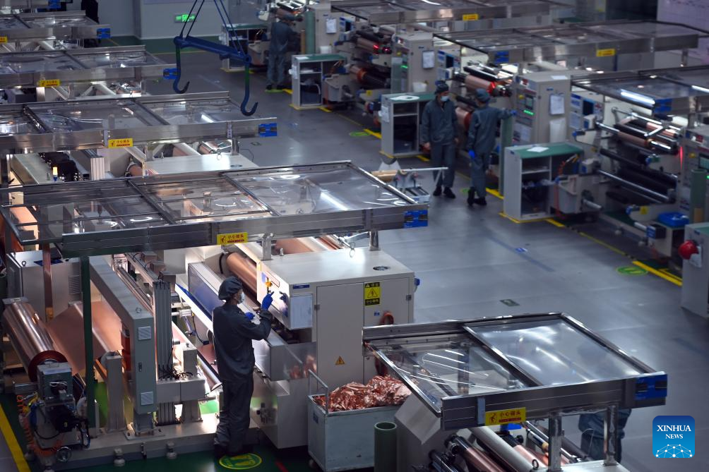 Workers work on a copper foil production line in Lanzhou New Area in Lanzhou, northwest China's Gansu Province, July 25, 2024. In recent years, Lanzhou New Area has introduced 1,080 high-quality industrial projects with a total investment of 528 billion yuan (about 72.8 billion U.S. dollars), and the annual increasing rate of industrial added value has maintained over 50 percent. From 2011 to 2023, the regional GDP of Lanzhou New Area has increased from less than 500 million yuan (about 69 million U.S. dollars) to 37.5 billion yuan (about 5.2 billion U.S. dollars). (Xinhua/Fan Peishen)