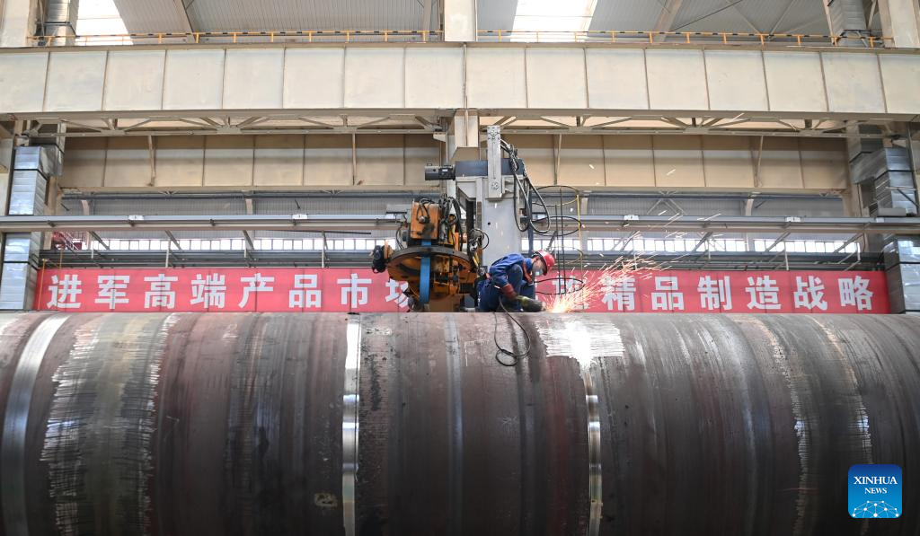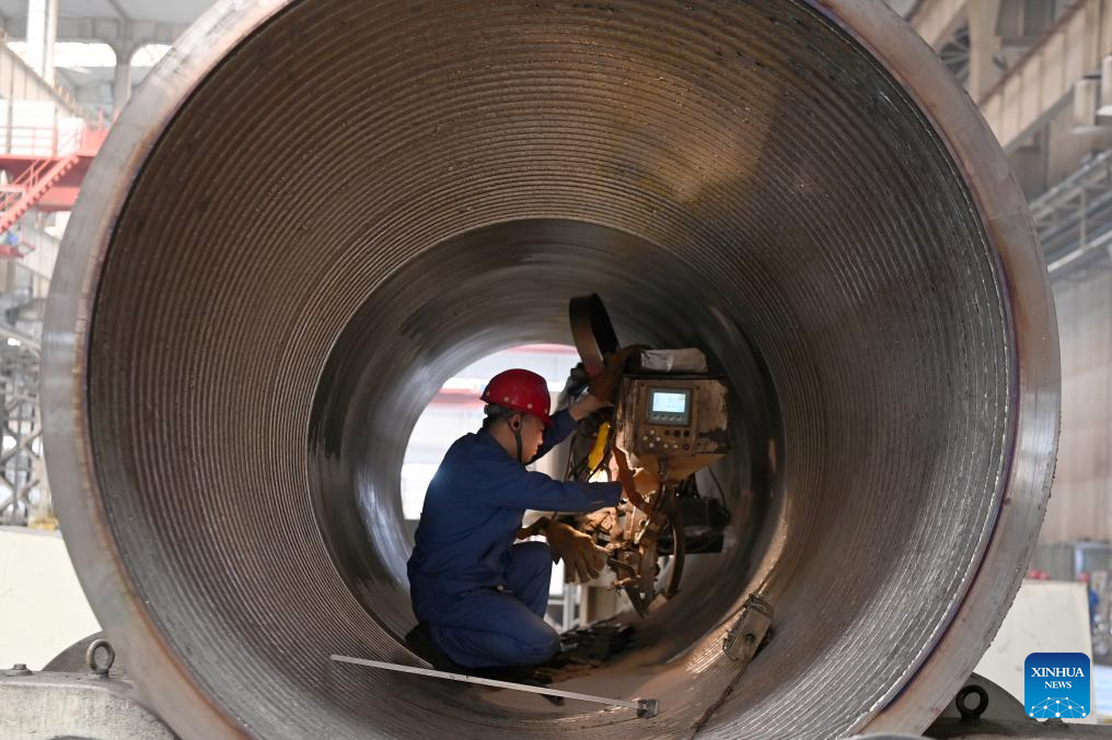 A worker welds in a workshop of LS Group High Tech Equipment Industrial Park of Lanzhou New Area in Lanzhou, northwest China's Gansu Province, July 25, 2024. In recent years, Lanzhou New Area has introduced 1,080 high-quality industrial projects with a total investment of 528 billion yuan (about 72.8 billion U.S. dollars), and the annual increasing rate of industrial added value has maintained over 50 percent. From 2011 to 2023, the regional GDP of Lanzhou New Area has increased from less than 500 million yuan (about 69 million U.S. dollars) to 37.5 billion yuan (about 5.2 billion U.S. dollars). (Xinhua/Fan Peishen)