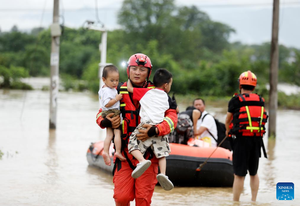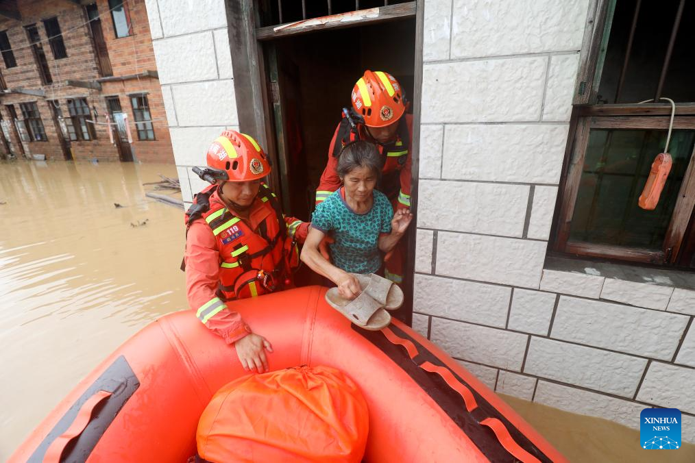 Rescuers relocate residents at Jingtang Village of Zixing City, central China's Hunan Province, July 28, 2024. The residual winds from Typhoon Gaemi continue to bring heavy rains to many places in Hunan Province, and local authorities are actively carrying out rescue and relief work. (Photo by Li Ke/Xinhua)