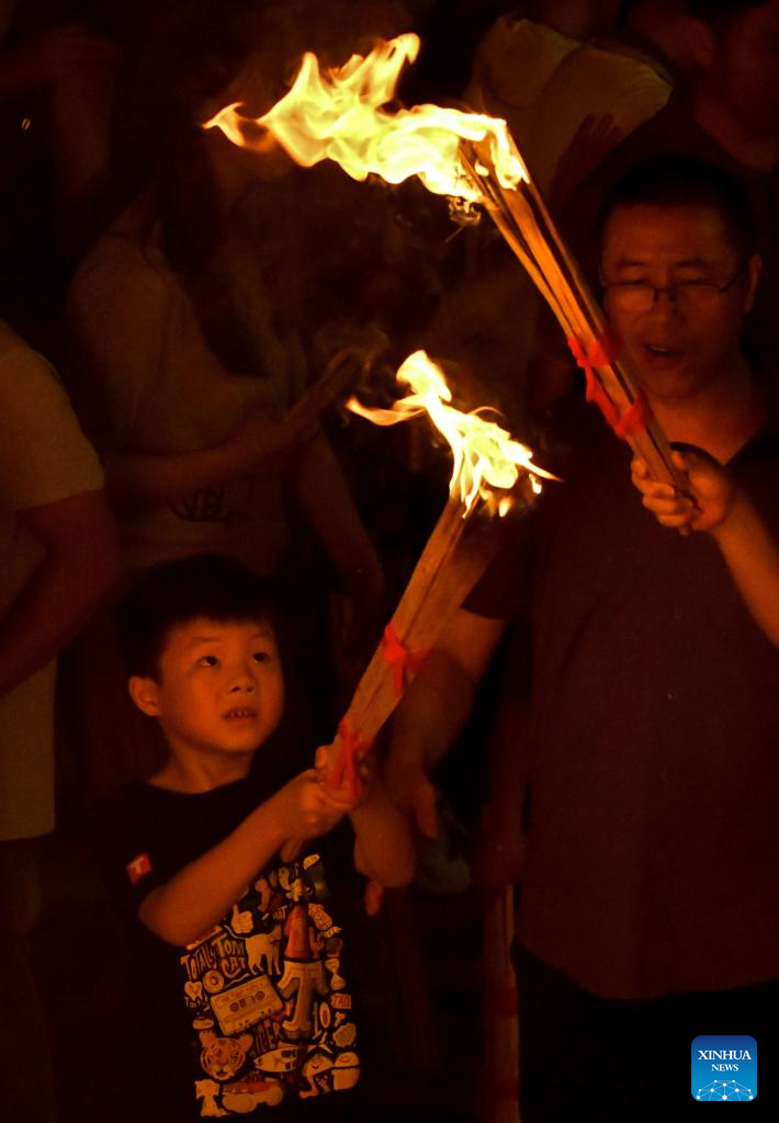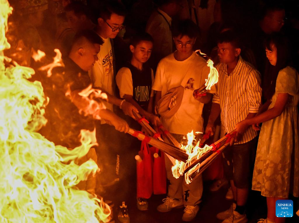 People light torches at a torch festival in Chuxiong, southwest China's Yunnan Province, July 27, 2024. A torch festival of the Yi ethnic group kicked off here on Saturday. (Xinhua/Wang Jingyi)