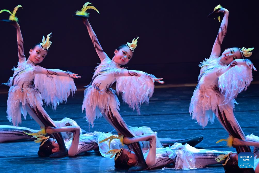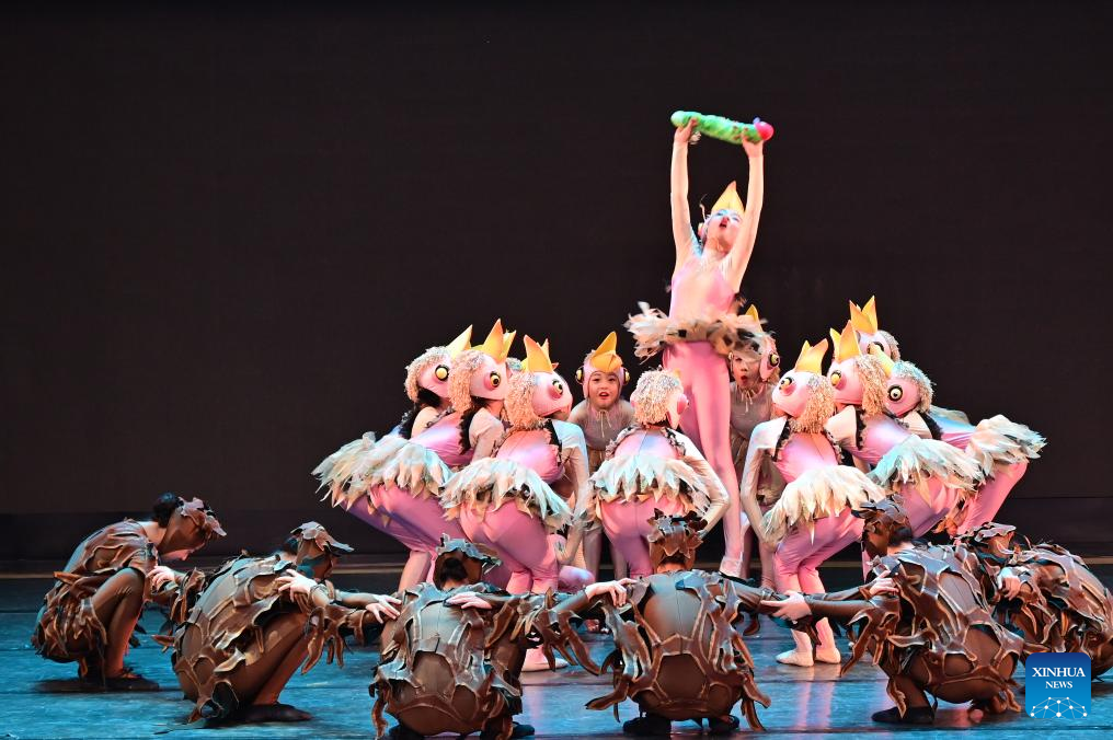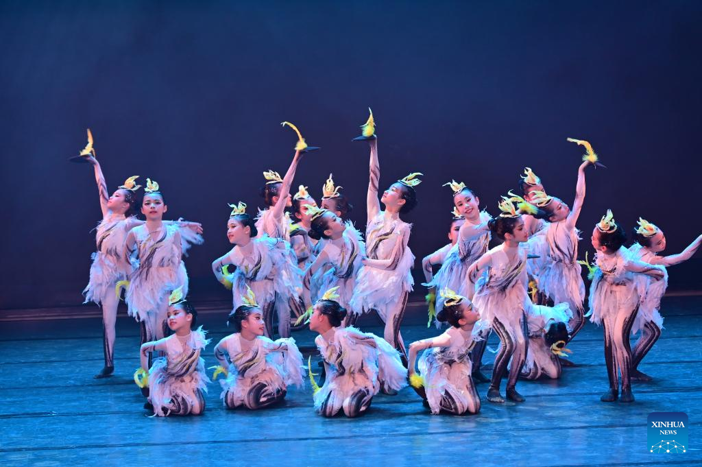 Children from the Pui Ching Middle School of Macao perform during the 2024 Tianjin International Children's Art Festival, in north China's Tianjin, July 23, 2024. (Xinhua)