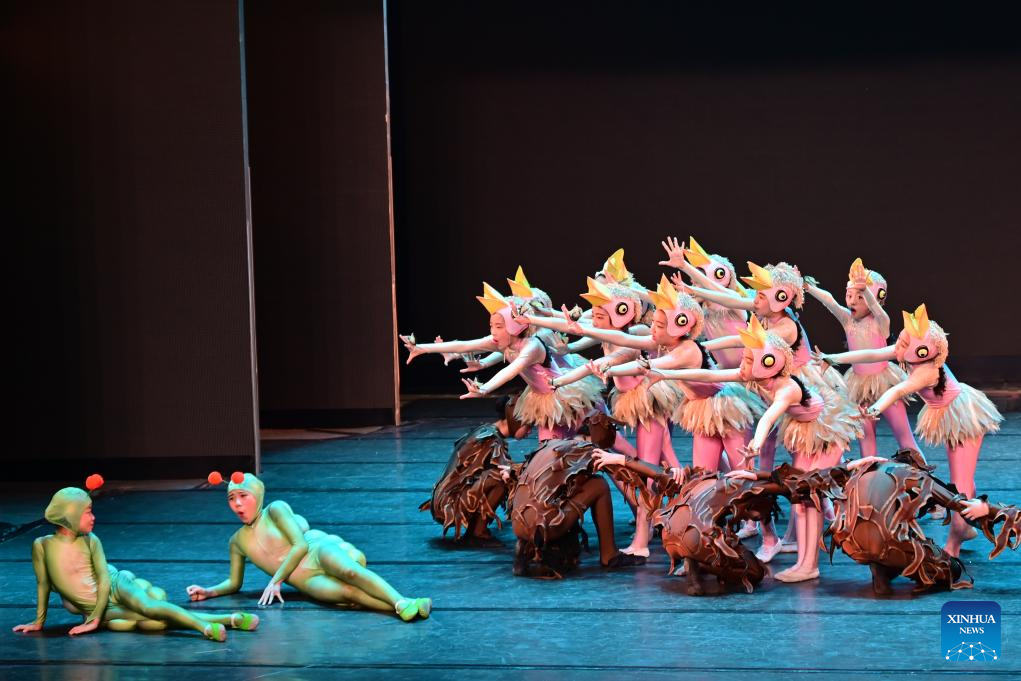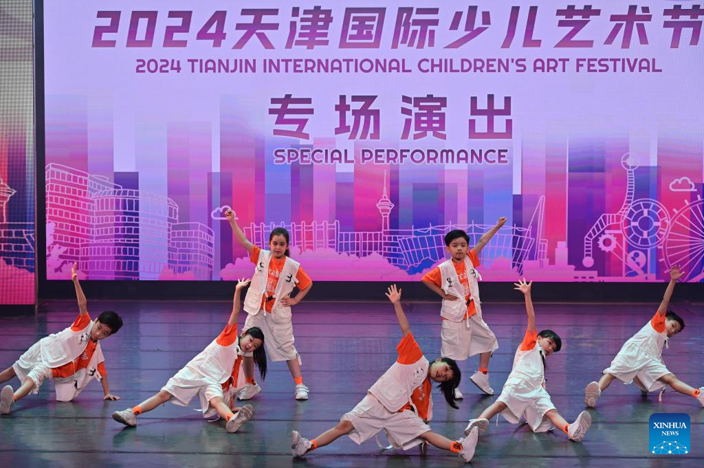 Children from the Macao Children Arts Troupe perform during the 2024 Tianjin International Children's Art Festival, in north China's Tianjin, July 23, 2024. (Xinhua)
