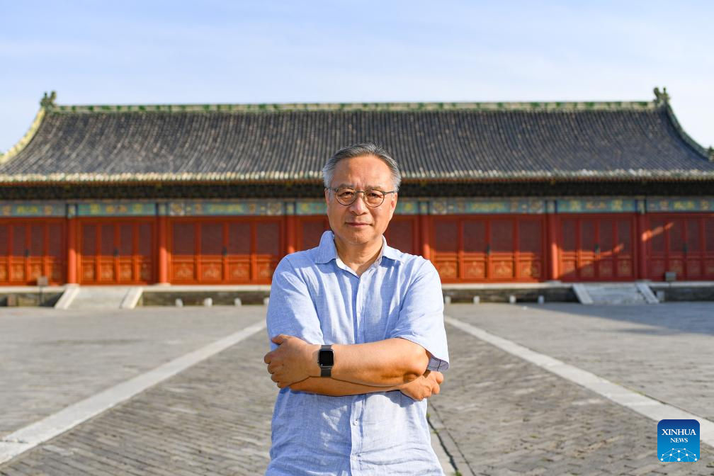 Lyu Zhou is pictured at the Altar of the God of Agriculture in Beijing, capital of China, June 18, 2024. Lyu Zhou is the group leader for text compiling on the Beijing Central Axis World Heritage application team and director of the National Heritage Center of Tsinghua University. (Xinhua/Chen Zhonghao)?
