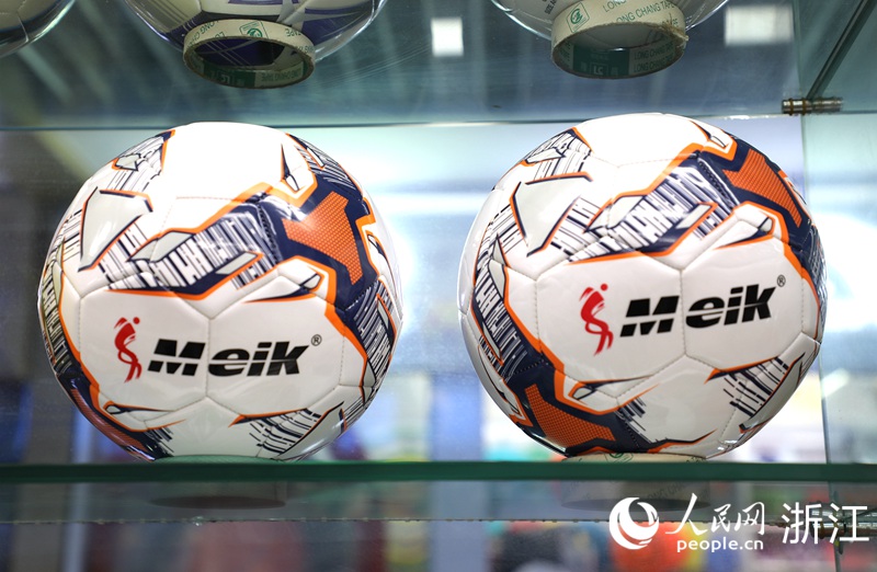 Photo shows football product samples at the shop of Aokai Sporting Equipments in the Yiwu International Trade Market in Yiwu, east China’s Zhejiang Province. (People’s Daily Online/Fang Pengyimeng)