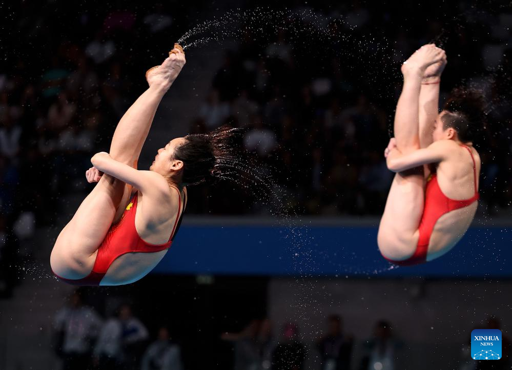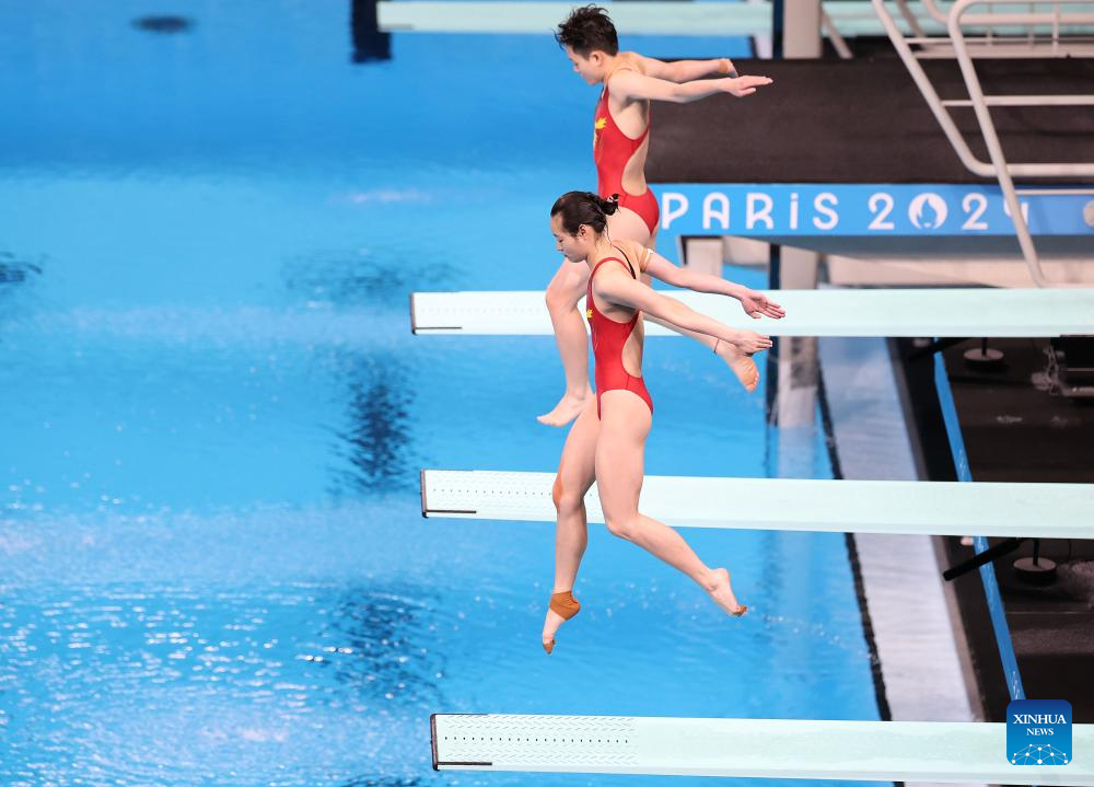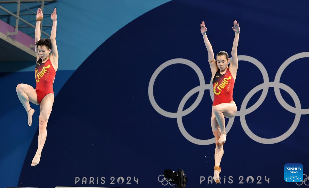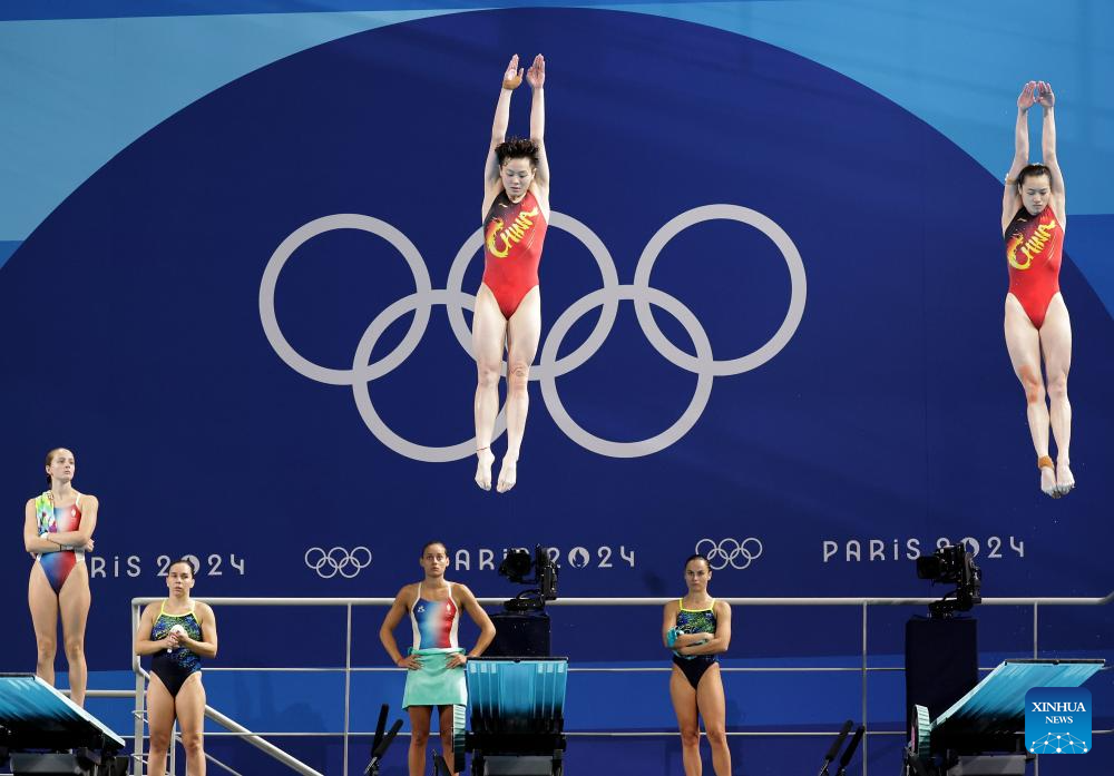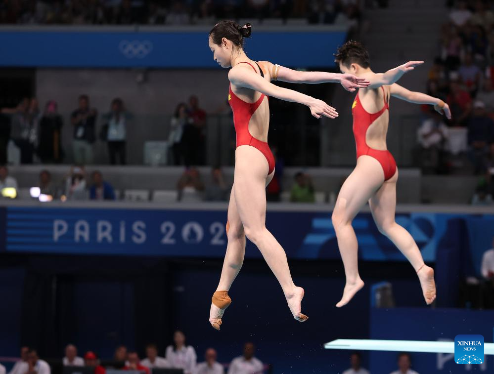Chang Yani (bottom)/Chen Yiwen of China compete during the women's synchronised 3m springboard final of diving at the Paris 2024 Olympic Games in Saint Denis, near Paris, France, on July 27, 2024. (Xinhua/Li Ming)