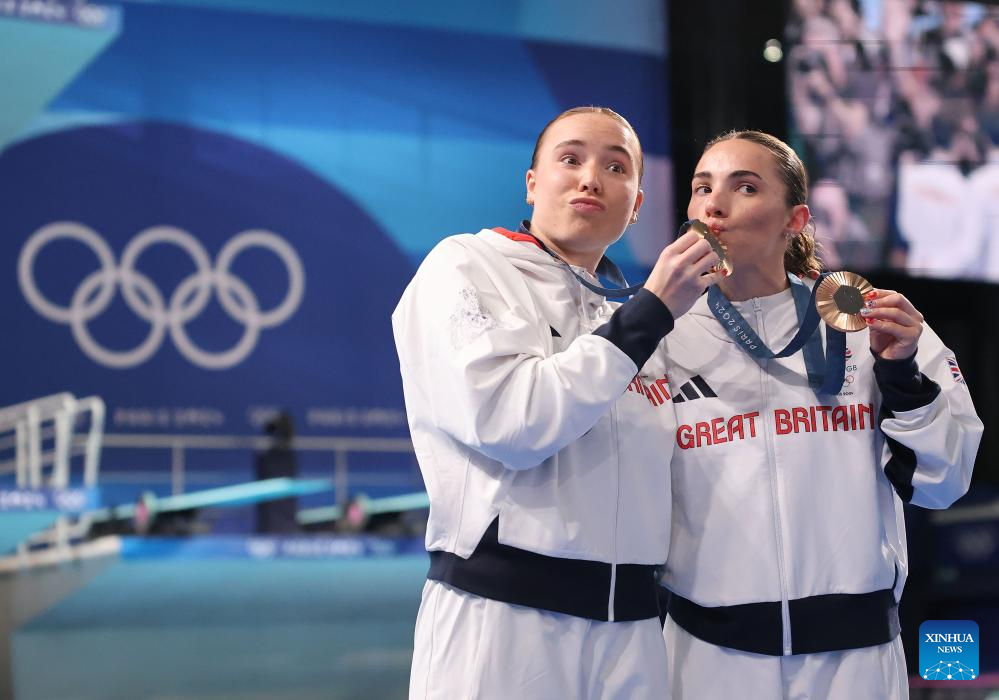 Bronze medalists Yasmin Harper (L)/Scarlett Mew Jensen of Britain celebrate during the awarding ceremony after the women's synchronised 3m springboard final of diving at the Paris 2024 Olympic Games in Saint Denis, near Paris, France, on July 27, 2024. (Xinhua/Zhang Yuwei)
