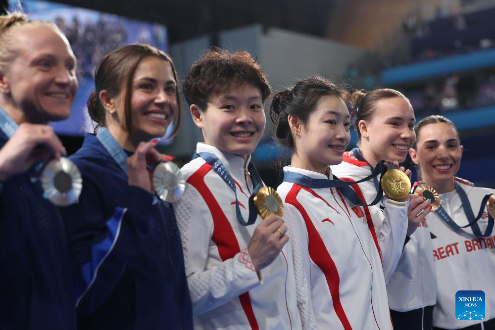 Silver medalists Sarah Bacon (1st L, upper)/Kassidy Cook (2nd L, upper) of the United States, gold medalists Chang Yani (L, bottom)/Chen Yiwen (R, bottom) of China and bronze medalists Yasmin Harper (2nd R, upper)/Scarlett Mew Jensen (1st R, upper) of Britain attend the awarding ceremony after the women's synchronised 3m springboard final of diving at the Paris 2024 Olympic Games in Saint Denis, near Paris, France, on July 27, 2024. (Xinhua/Li Ying)