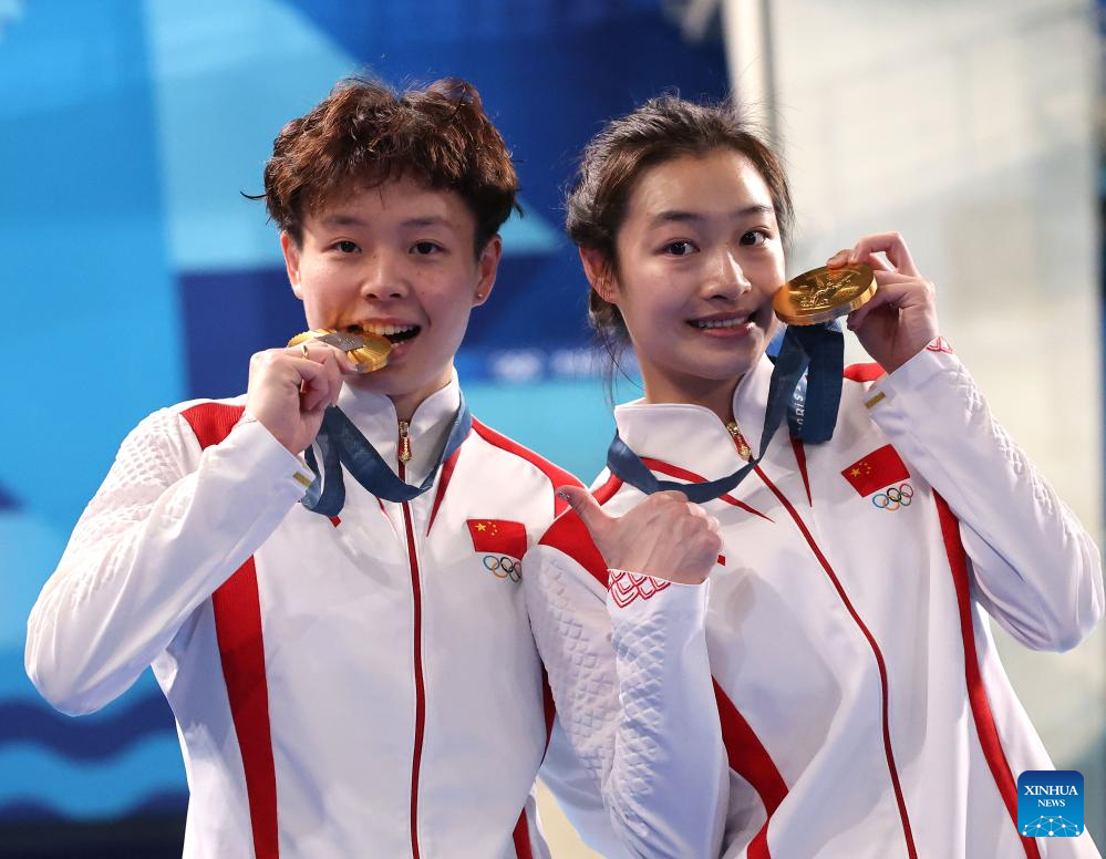Gold medalists Chang Yani (L)/Chen Yiwen of China celebrate during the awarding ceremony after the women's synchronised 3m springboard final of diving at the Paris 2024 Olympic Games in Saint Denis, near Paris, France, on July 27, 2024. (Xinhua/Zhang Yuwei)