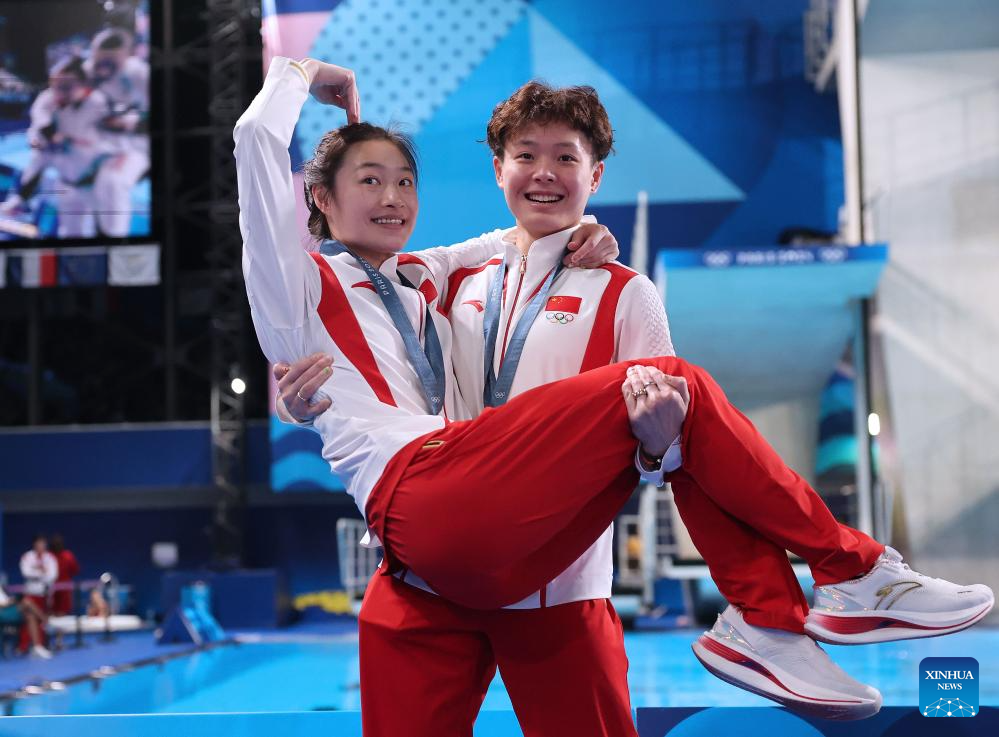 Chang Yani (front)/Chen Yiwen of China celebrate during the women's synchronised 3m springboard final of diving at the Paris 2024 Olympic Games in Saint Denis, near Paris, France, on July 27, 2024. (Xinhua/Li Ming)