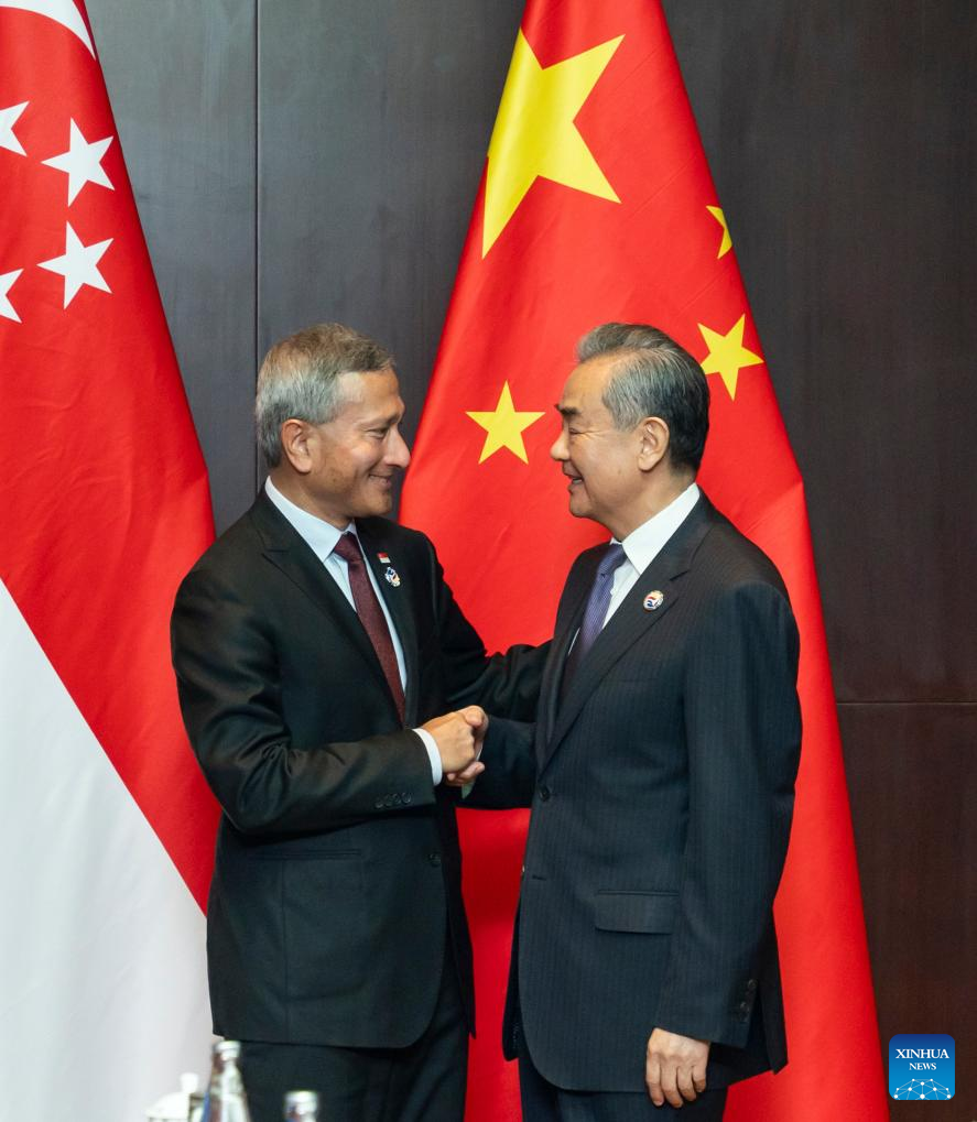 VIENTIANE, July 27 (Xinhua) -- Chinese Foreign Minister Wang Yi on Saturday met here with his Singaporean counterpart Vivian Balakrishnan, saying that the two sides should jointly build the Belt and Road with high quality and upgrade bilateral cooperation.