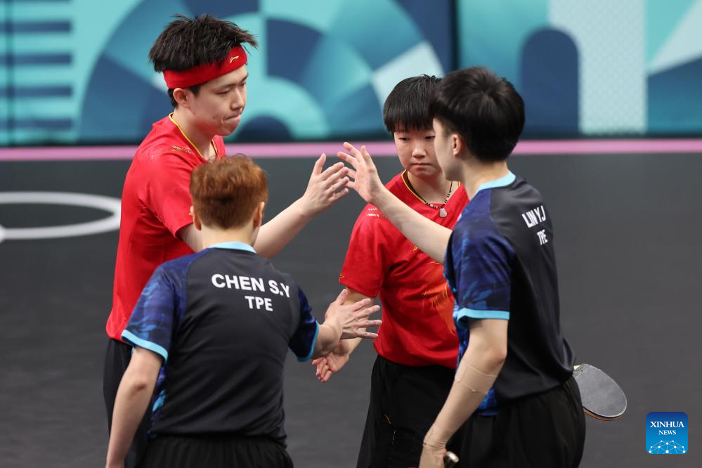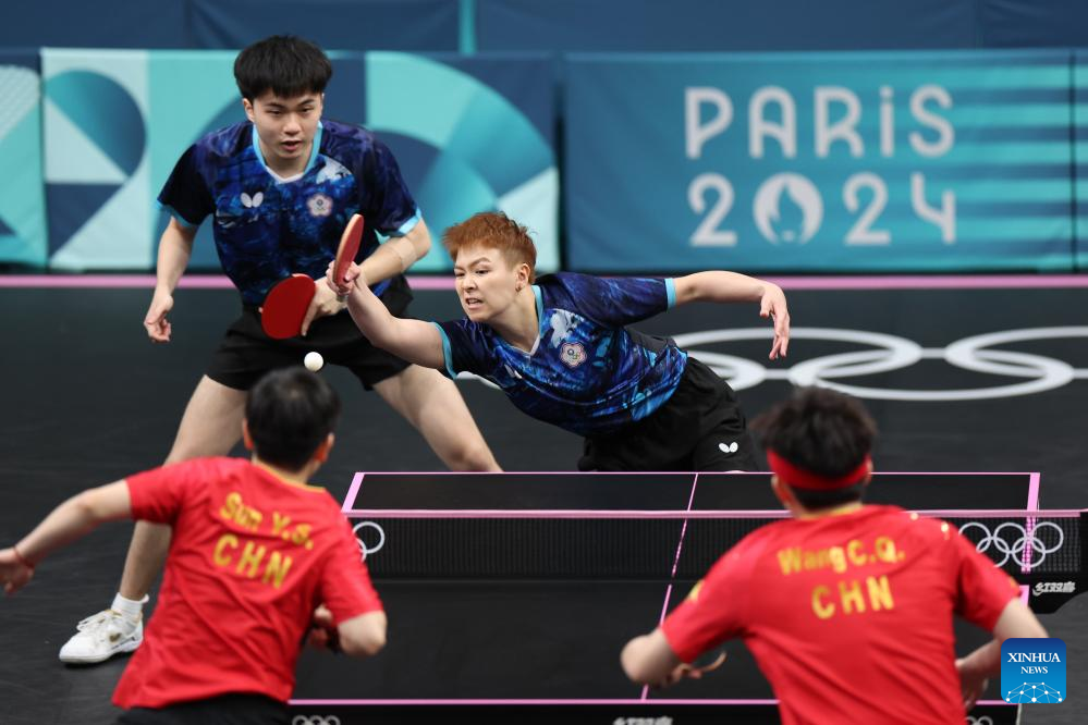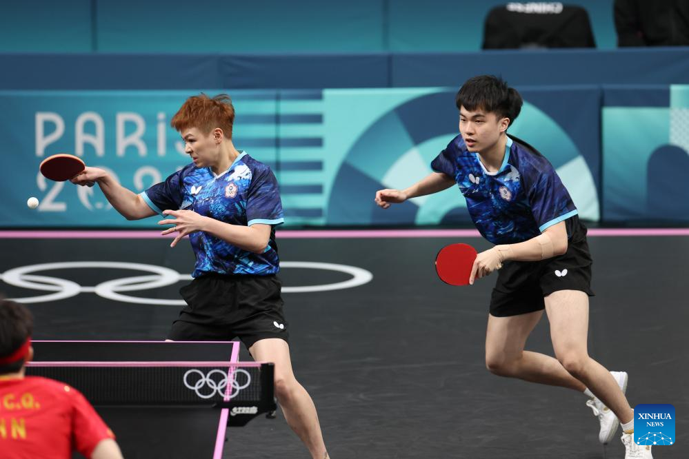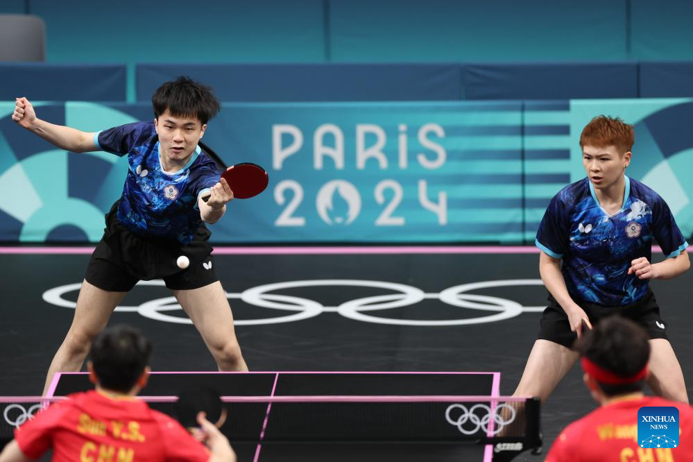 Lin Yun-Ju /Chen Szu-Yu (R) of Chinese Taipei compete during the mixed doubles quarterfinal table tennis match between Wang Chuqin/Sun Yingsha of China and Lin Yun-Ju/Chen Szu-Yu of Chinese Taipei at the Paris 2024 Olympic Games in Paris, France, on July 28, 2024. (Xinhua/Liu Xu)
