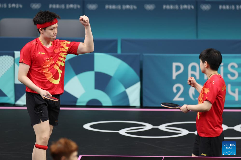 Wang Chuqin(L)/Sun Yingsha of China celebrate during the mixed doubles quarterfinal table tennis match between Wang Chuqin/Sun Yingsha of China and Lin Yun-Ju/Chen Szu-Yu of Chinese Taipei at the Paris 2024 Olympic Games in Paris, France, on July 28, 2024. (Xinhua/Liu Xu)