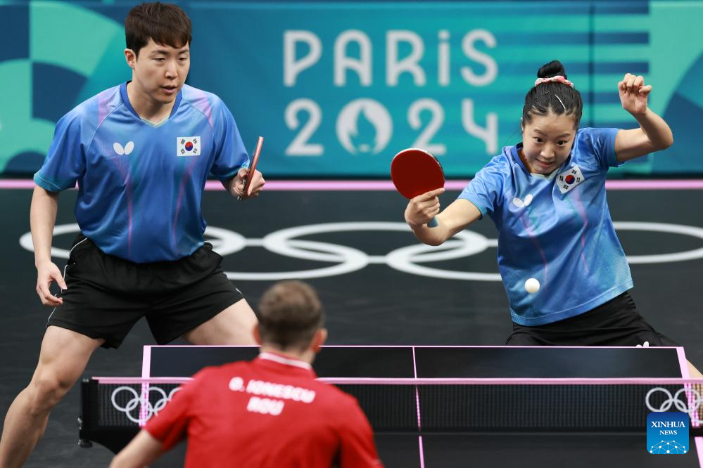 Lim Jonghoon/Shin Yubin (R) of South Korea compete during the mixed doubles quarterfinal table tennis match between Lim Jonghoon/Shin Yubin of South Korea and Ovidiu Ionescu/Bernadette Szocs of Romania at the Paris 2024 Olympic Games in Paris, France, on July 28, 2024. (Xinhua/Liu Xu)