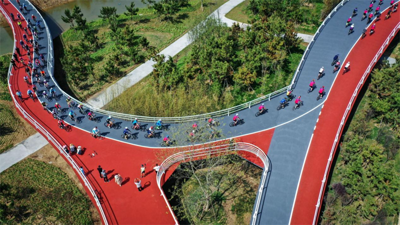 Cycling enthusiasts ride along the Sunshine Coast Greenway in Rizhao city, east China’s Shandong Province. (Photo/Li Bing)