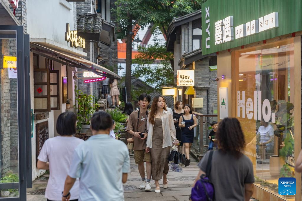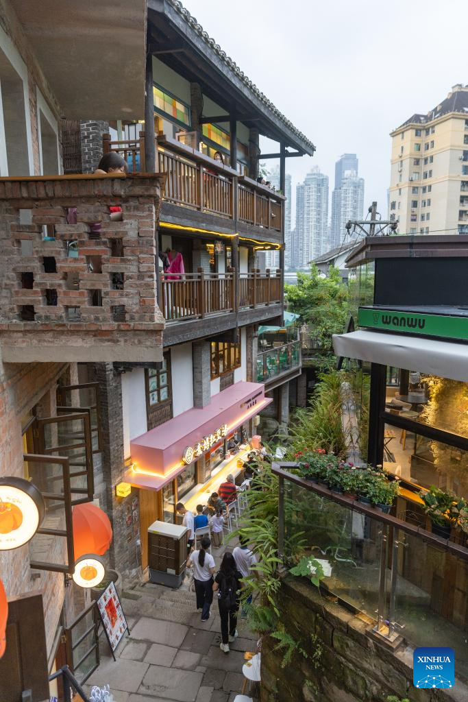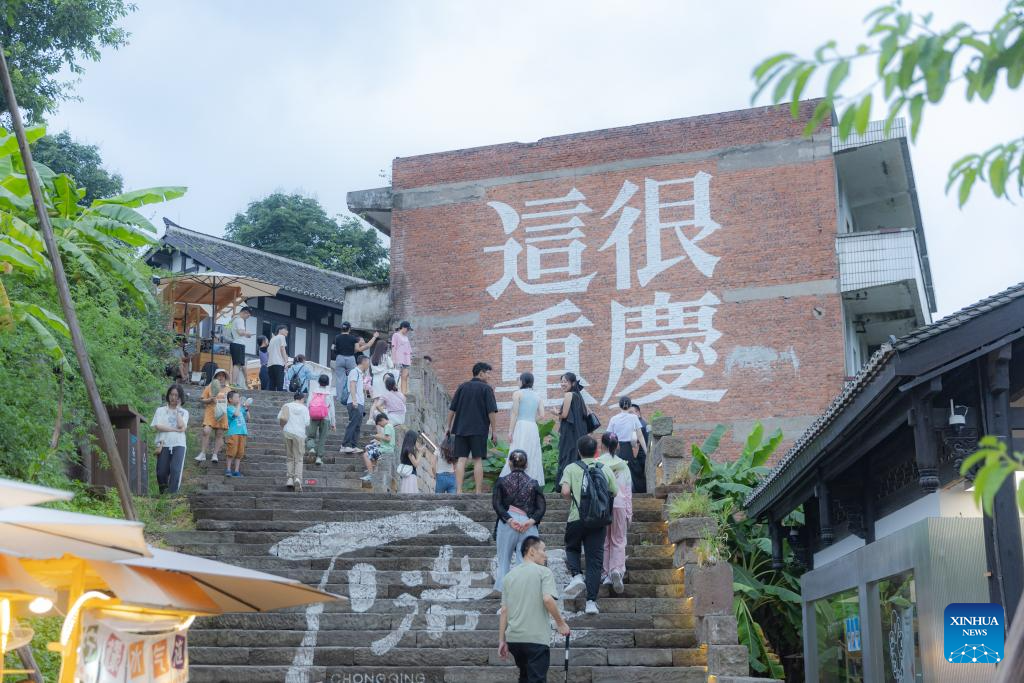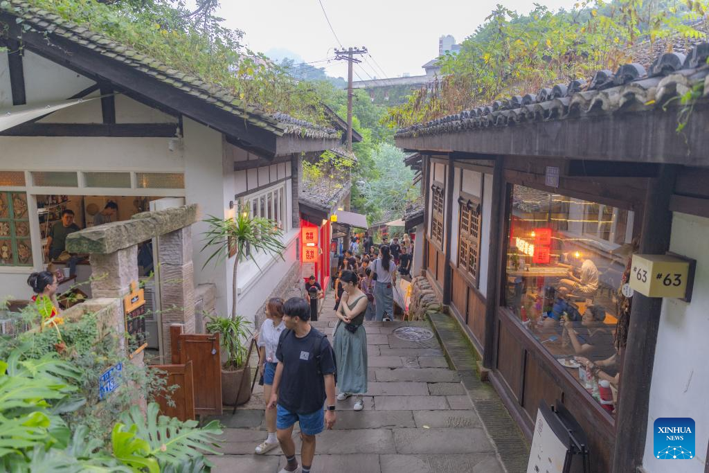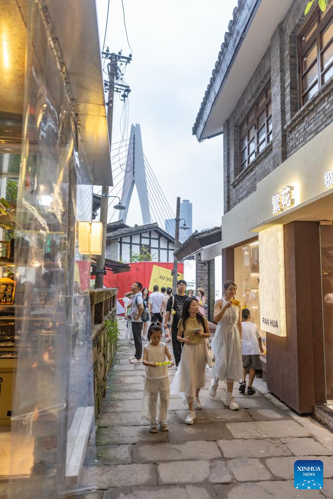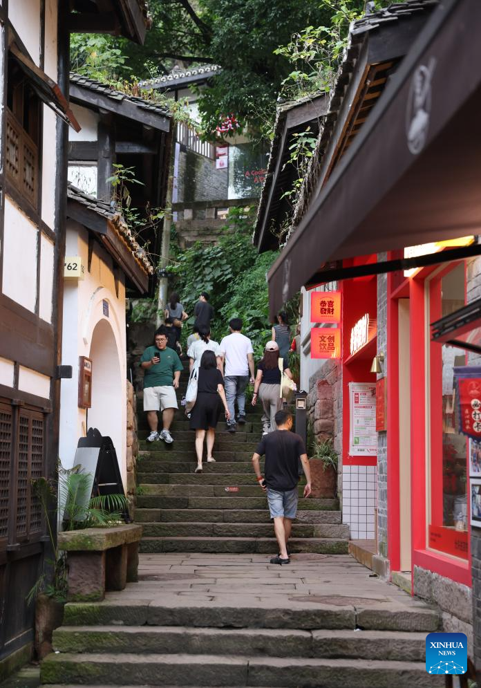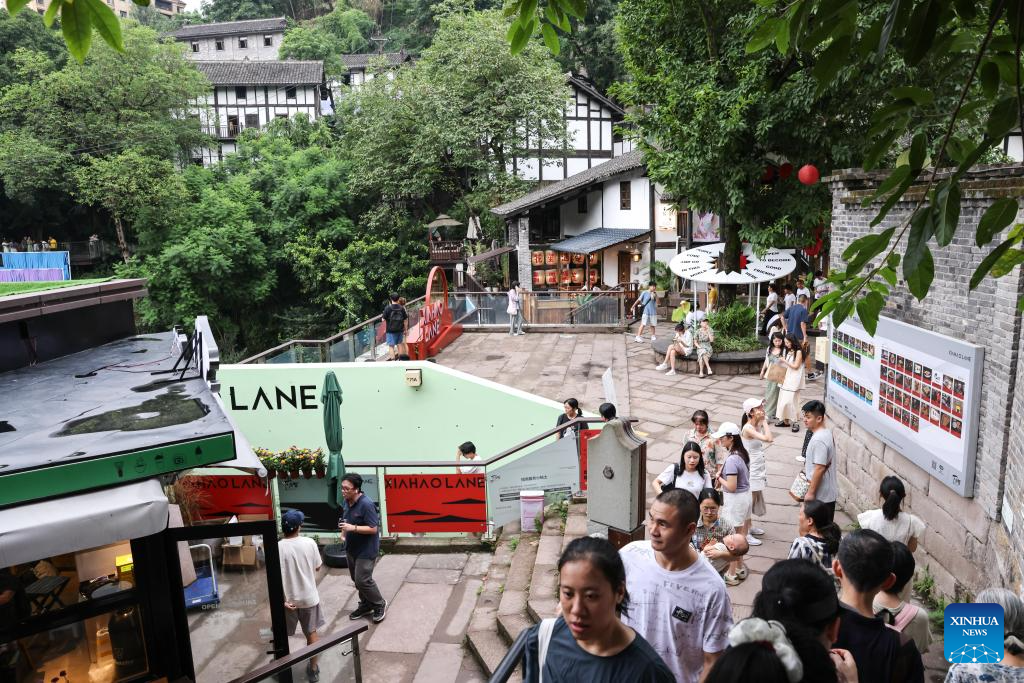 Tourists visit Longmenhao old street in Nan'an District in southwest China's Chongqing Municipality, July 28, 2024. Longmenhao old street, featuring more than 200 ancient architectures built in different forms and periods, was listed in the first batch of urban renewal pilot projects launched by Chongqing. In recent years, local authorities have been integrating natural, cultural, artistic, digital and other elements into the renovation of the street, and readjusting the layout according to its historical and cultural characteristics. The creative renovation and upgrading have incentivized young entrepreneurs, injected new vigor into the street and attracted more visitors. (Xinhua/Lyu Shuai)