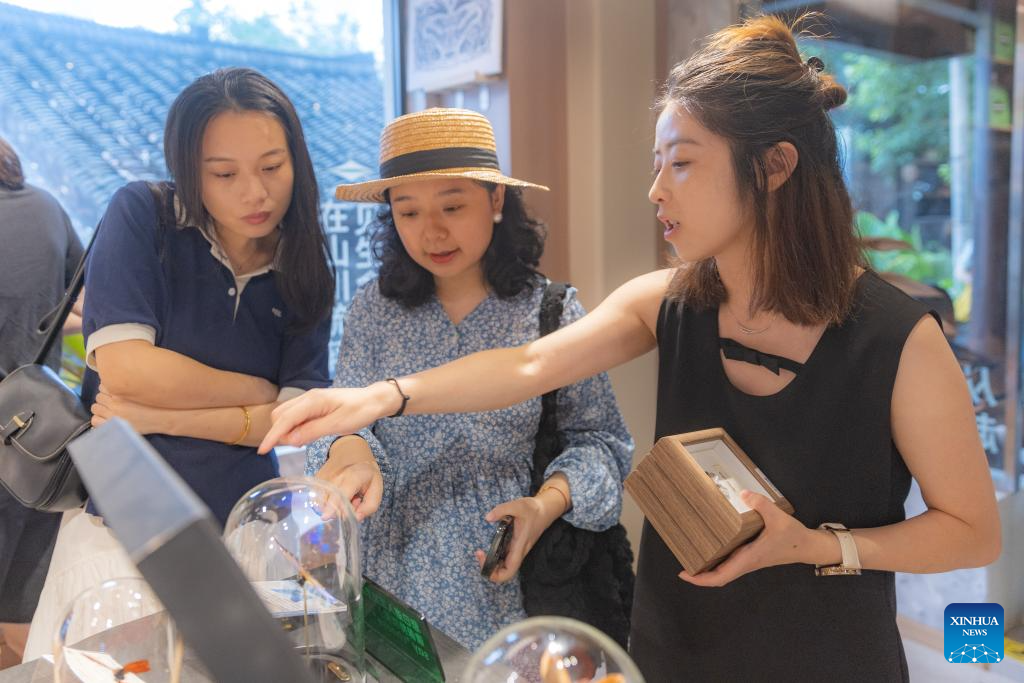 Tourists view specimens at a store on Longmenhao old street in Nan'an District in southwest China's Chongqing Municipality, July 28, 2024. Longmenhao old street, featuring more than 200 ancient architectures built in different forms and periods, was listed in the first batch of urban renewal pilot projects launched by Chongqing. In recent years, local authorities have been integrating natural, cultural, artistic, digital and other elements into the renovation of the street, and readjusting the layout according to its historical and cultural characteristics. The creative renovation and upgrading have incentivized young entrepreneurs, injected new vigor into the street and attracted more visitors. (Xinhua/Huang Wei)