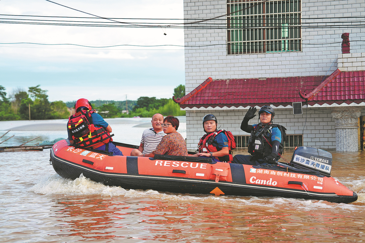 Rescuers evacuate people trapped by floodwaters on Monday in Xiangtan county, Hunan province. (YANG HUAFENG/CHINA NEWS SERVICE)