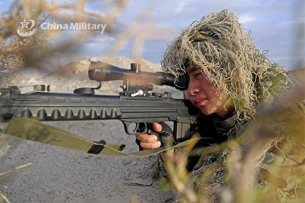 A sniper in ghillie suit assigned to a troop under the PLA Rocket Force aims through scope during a multi-subject training exercise on June 23, 2024. (eng.chinamil.com.cn/Photo by Zhang Feng)