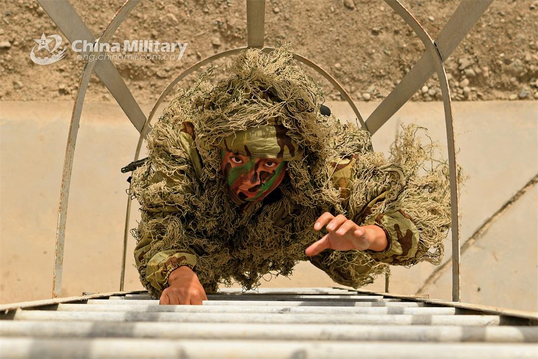 A soldier in ghillie suit assigned to a troop under the PLA Rocket Force climbs up a cat ladder during a multi-subject training exercise on June 23, 2024. (eng.chinamil.com.cn/Photo by Zhang Feng)