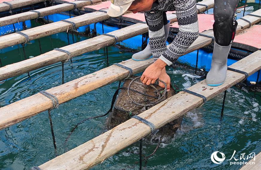 Wang Rongbiao raises an abalone farming cage from the water surface in a mariculture zone located in Tongxin village, Ankai town, Lianjiang county, Fuzhou city, southeast China's Fujian Province. (People's Daily Online/Huang Dongyi)