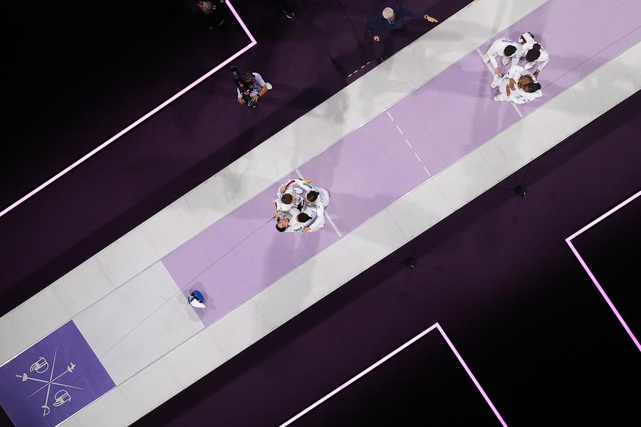 Athletes of Italy (L) and France react after the women's epee team gold medal match of fencing at the Paris Olympics on July 30, 2024. (Xinhua/Xu Zijian)