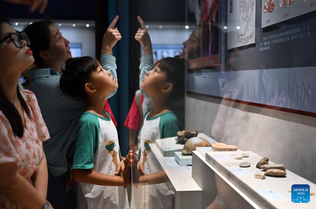 Visitors view an exhibit during the Zhoukoudian Site Cultural Exhibition at the Hainan Museum in Haikou, south China's Hainan Province, July 30, 2024. The Zhoukoudian Site Cultural Exhibition opened here on Tuesday with a total of 139 pieces of exhibits from the Zhoukoudian Site Museum in Beijing. (Xinhua/Guo Cheng)