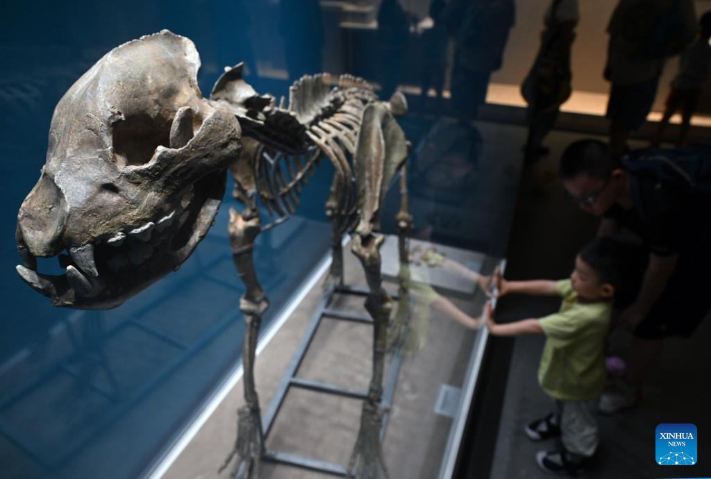 A child visits a replica of a skull of Peking Man during the Zhoukoudian Site Cultural Exhibition at the Hainan Museum in Haikou, south China's Hainan Province, July 30, 2024. The Zhoukoudian Site Cultural Exhibition opened here on Tuesday with a total of 139 pieces of exhibits from the Zhoukoudian Site Museum in Beijing. (Xinhua/Guo Cheng)