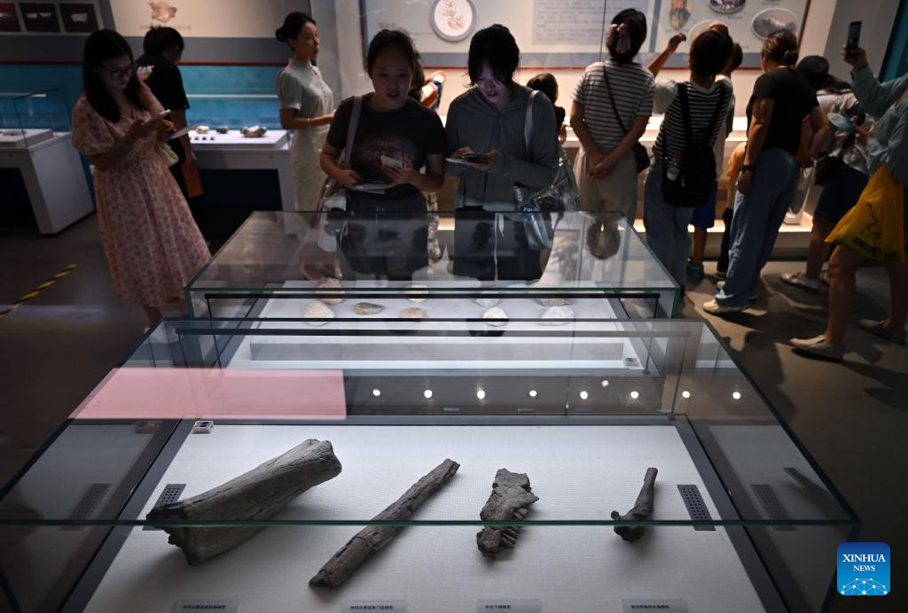 Visitors view exhibits during the Zhoukoudian Site Cultural Exhibition at the Hainan Museum in Haikou, south China's Hainan Province, July 30, 2024. The Zhoukoudian Site Cultural Exhibition opened here on Tuesday with a total of 139 pieces of exhibits from the Zhoukoudian Site Museum in Beijing. (Xinhua/Guo Cheng)