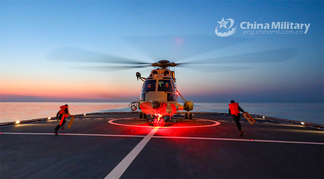 A ship-borne helicopter attached to a combat support ship flotilla under the PLA Navy conducts nighttime take-off and landing training during a multi-subject maritime training exercise on June 6, 2024. (eng.chinamil.com.cn/Photo by Yu Peng)