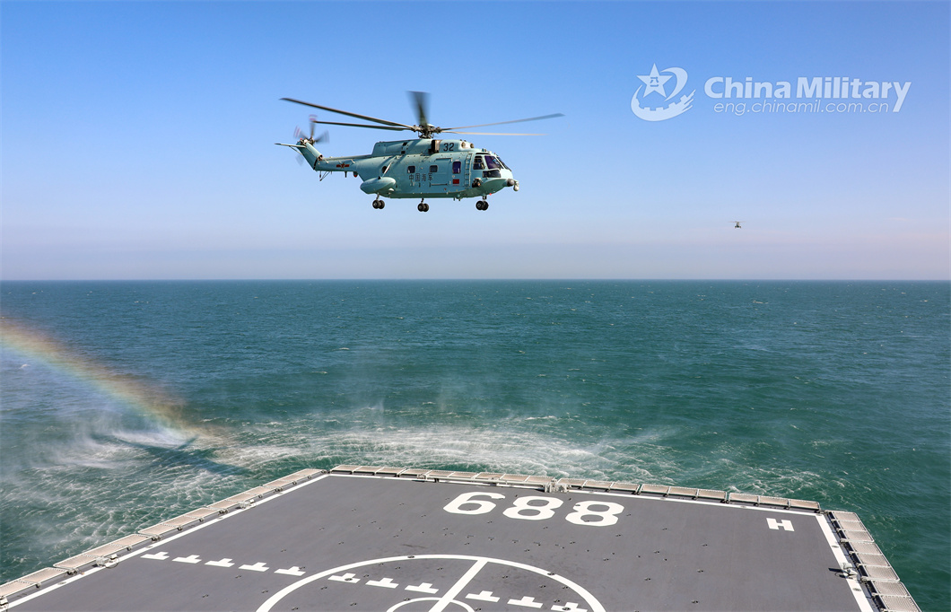 A ship-borne helicopter attached to a combat support ship flotilla under the PLA Navy conducts take-off and landing training during a multi-subject maritime training exercise on June 6, 2024. (eng.chinamil.com.cn/Photo by Yu Peng)