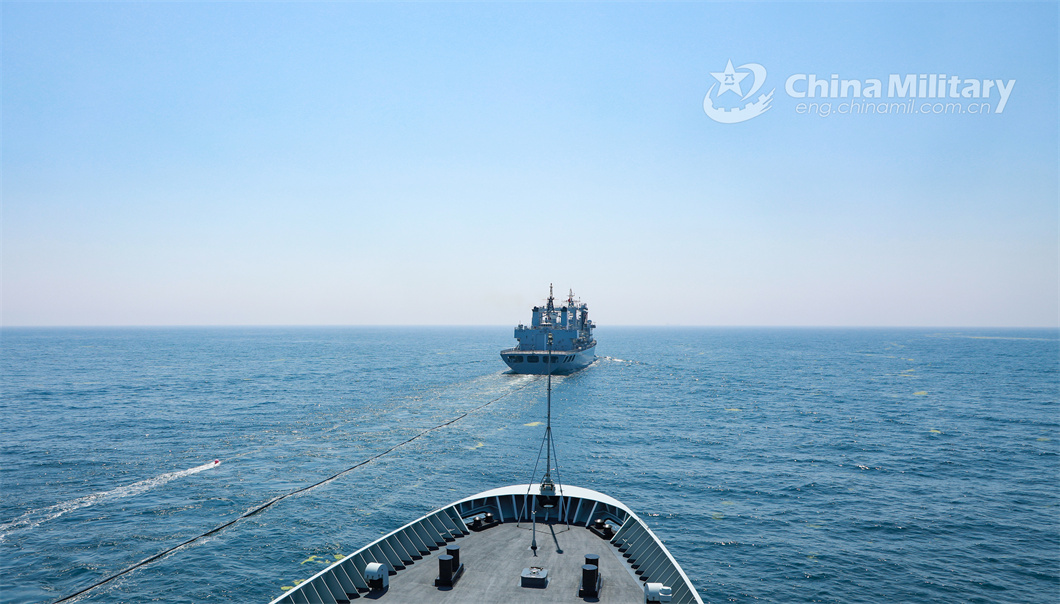 Vessels attached to a combat support ship flotilla under the PLA Navy conduct astern replenishment-at-sea during a multi-subject maritime training exercise on June 6, 2024. (eng.chinamil.com.cn/Photo by Li Qiutong)
