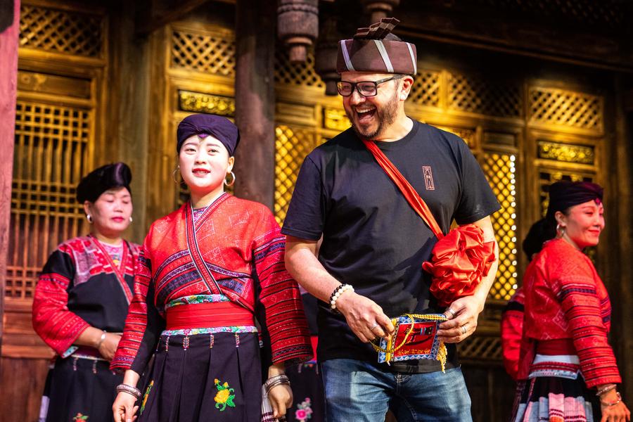 A foreign tourist interacts with locals during a performance in Huangluo Village of Longsheng County, south China's Guangxi Zhuang Autonomous Region, June 26, 2024. (Xinhua/Chen Sihan)