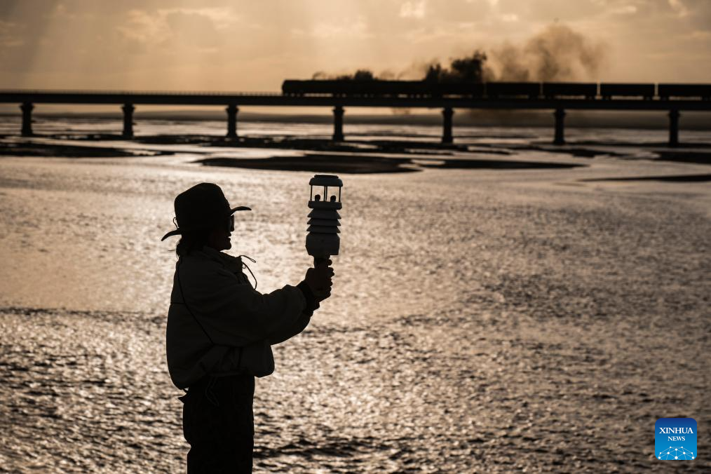 A researcher measures the meteorological conditions at a section of Tuotuo River in northwest China's Qinghai Province, July 24, 2024. (Xinhua/Wu Zhizun)