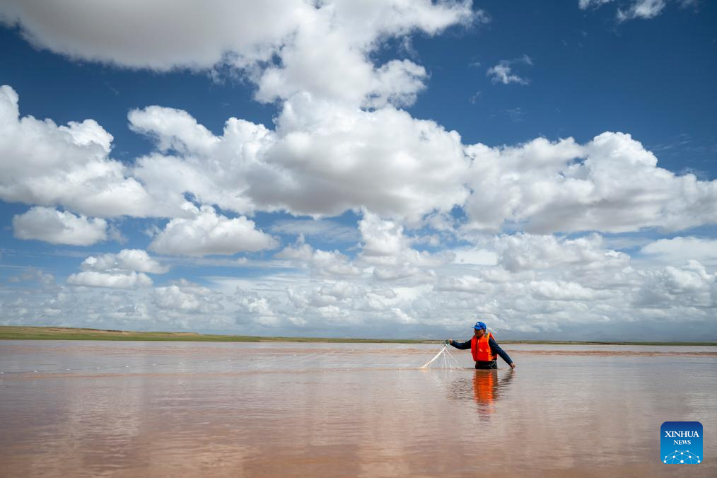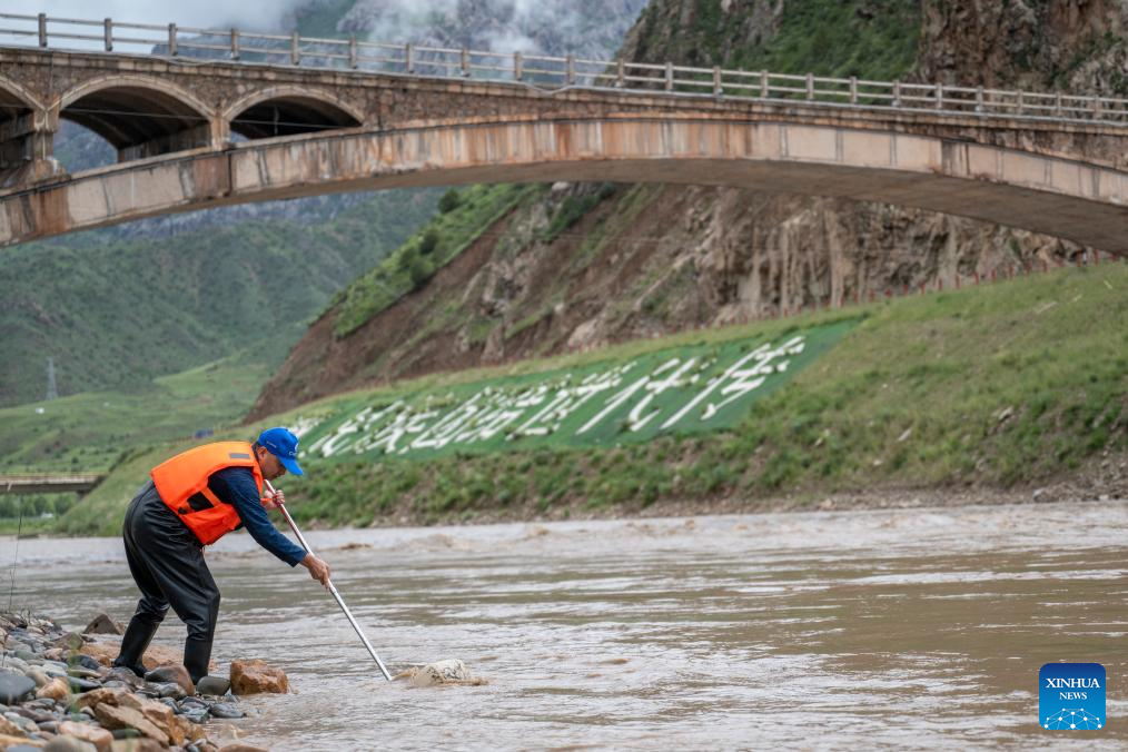 A researcher conducts on-site fish monitoring in Nangjibalong, where the Tuotuo River and Damqu River converge, in northwest China's Qinghai Province, July 24, 2024. (Xinhua/Wu Zhizun)