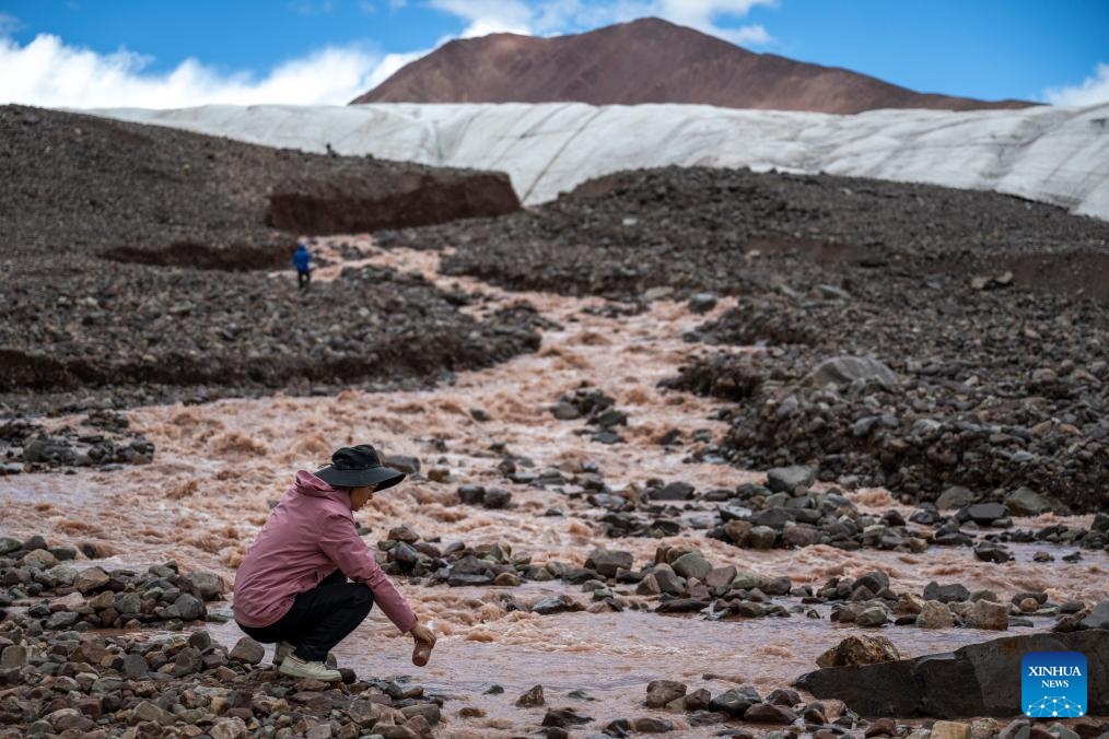 A researcher collects water samples at the Dongkemadi glacier in northwest China's Qinghai Province, July 25, 2024. (Xinhua/Wu Zhizun)