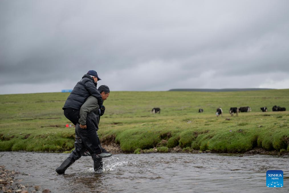 Researchers probe underground water level around the Nieqiaqu River in northwest China's Qinghai Province, July 23, 2024. (Xinhua/Wu Zhizun)