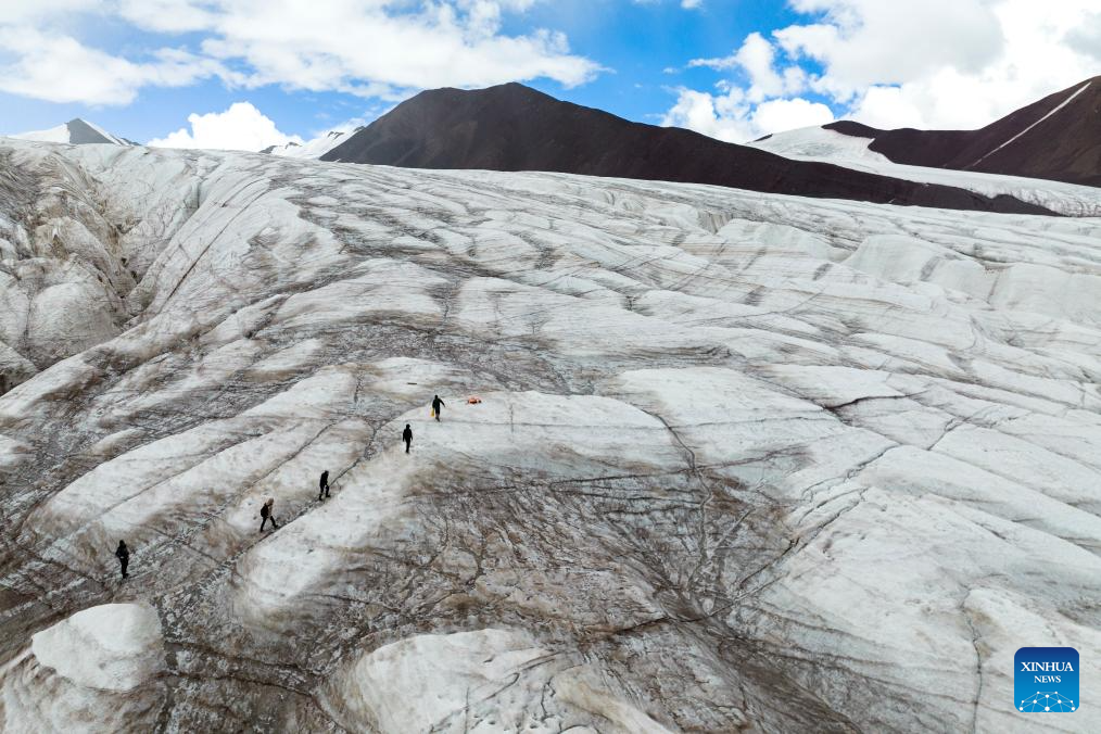 An aerial drone photo shows researchers climbing the Dongkemadi glacier in northwest China's Qinghai Province, July 25, 2024. (Xinhua/Wu Zhizun)