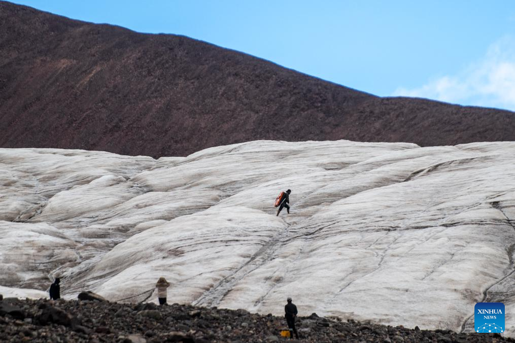 Researchers climb the Dongkemadi glacier in northwest China's Qinghai Province, July 25, 2024. (Xinhua/Wu Zhizun)
