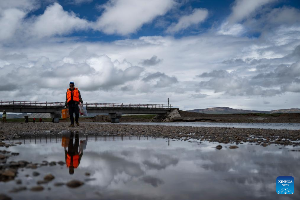Researchers walk on their way to a sampling site in Nangjibalong, where the Tuotuo River and Damqu River converge, in northwest China's Qinghai Province, July 24, 2024. (Xinhua/Wu Zhizun)