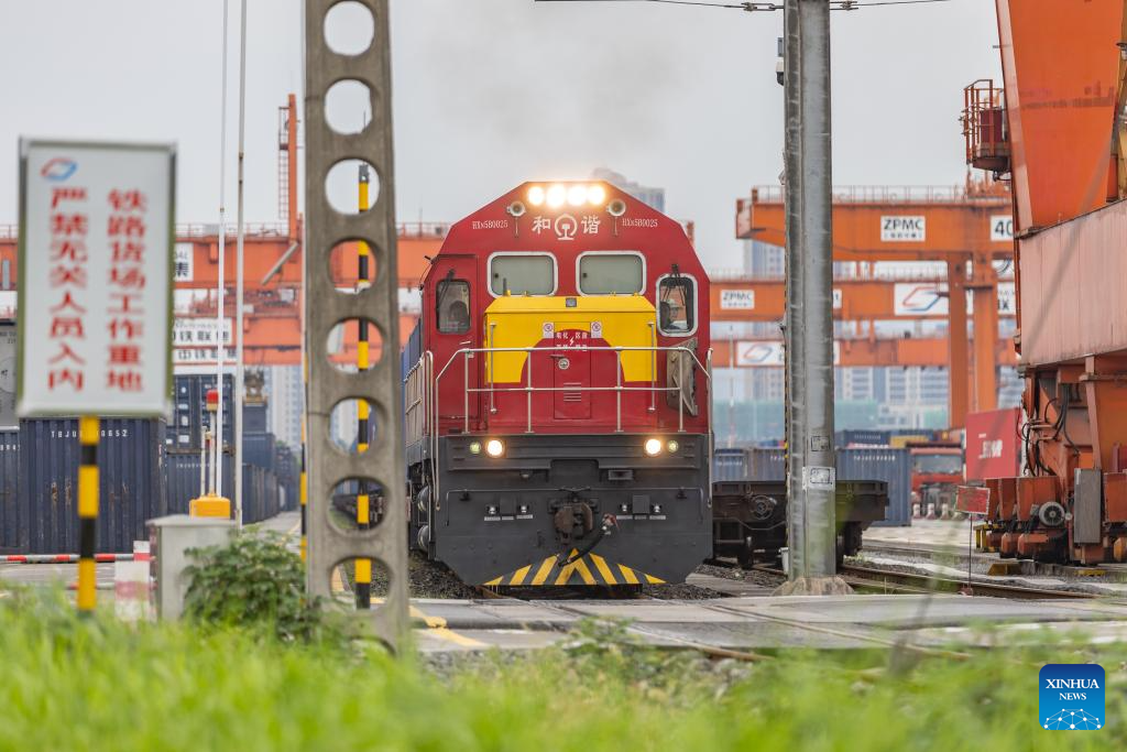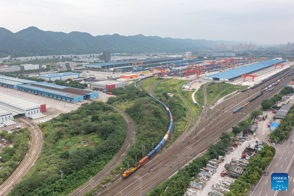 A China-Europe freight train departs from the Tuanjiecun Station of Chongqing International Logistics Hub Park in Shapingba District of Chongqing, southwest China, July 30, 2024. (Xinhua/Huang Wei)