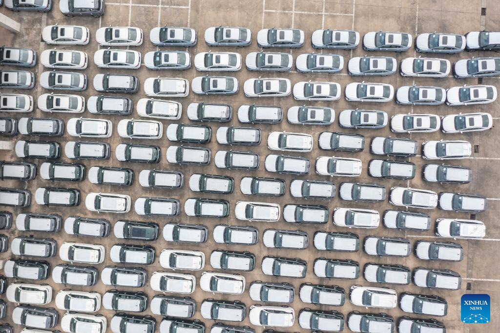 An aerial drone photo taken on July 30, 2024 shows vehicles to be exported at the Chongqing Railway Port of Chongqing International Logistics Hub Park in Shapingba District of Chongqing, southwest China. (Xinhua/Huang Wei)