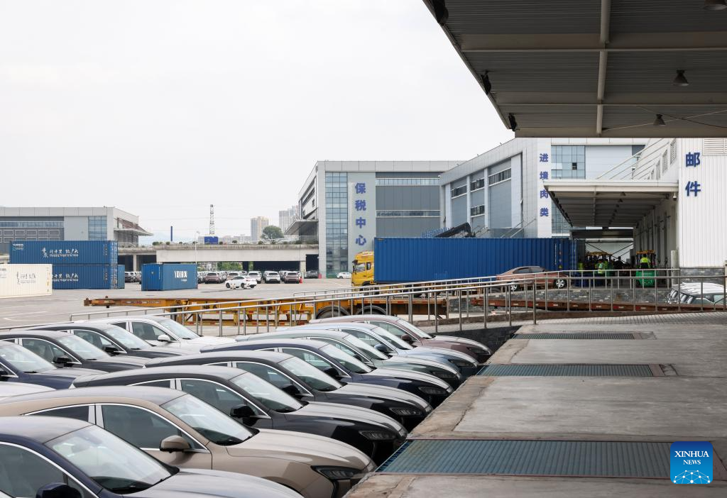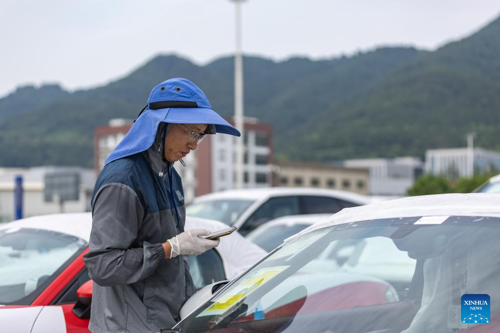 A staff member checks imported vehicles at the Chongqing Railway Port of Chongqing International Logistics Hub Park in Shapingba District of Chongqing, southwest China, July 30, 2024. (Xinhua/Huang Wei)