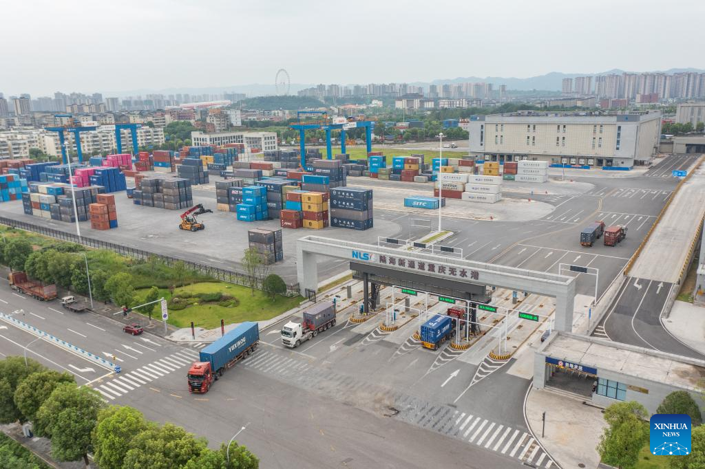 An aerial drone photo taken on July 30, 2024 shows vehicles transferring containers at the dry port of the New International Land-Sea Trade Corridor in Chongqing International Logistics Hub Park in Shapingba District of Chongqing, southwest China. (Xinhua/Huang Wei)