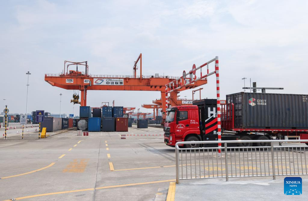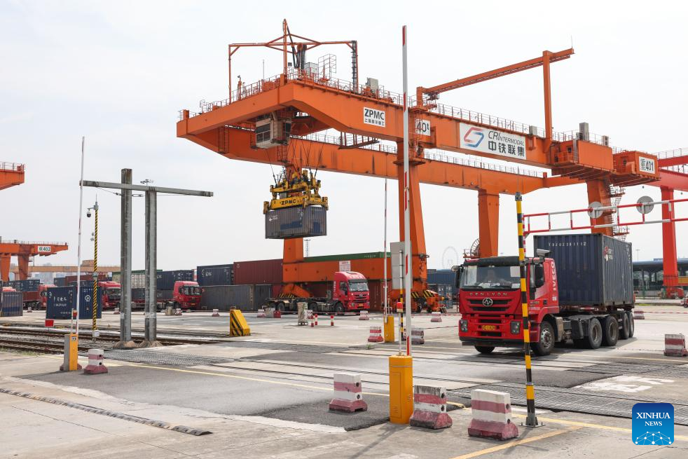 A vehicle transfers a container at the dry port of the New International Land-Sea Trade Corridor in the Chongqing International Logistics Hub Park in Shapingba District of Chongqing, southwest China, July 30, 2024. (Xinhua/Lyu Shuai)