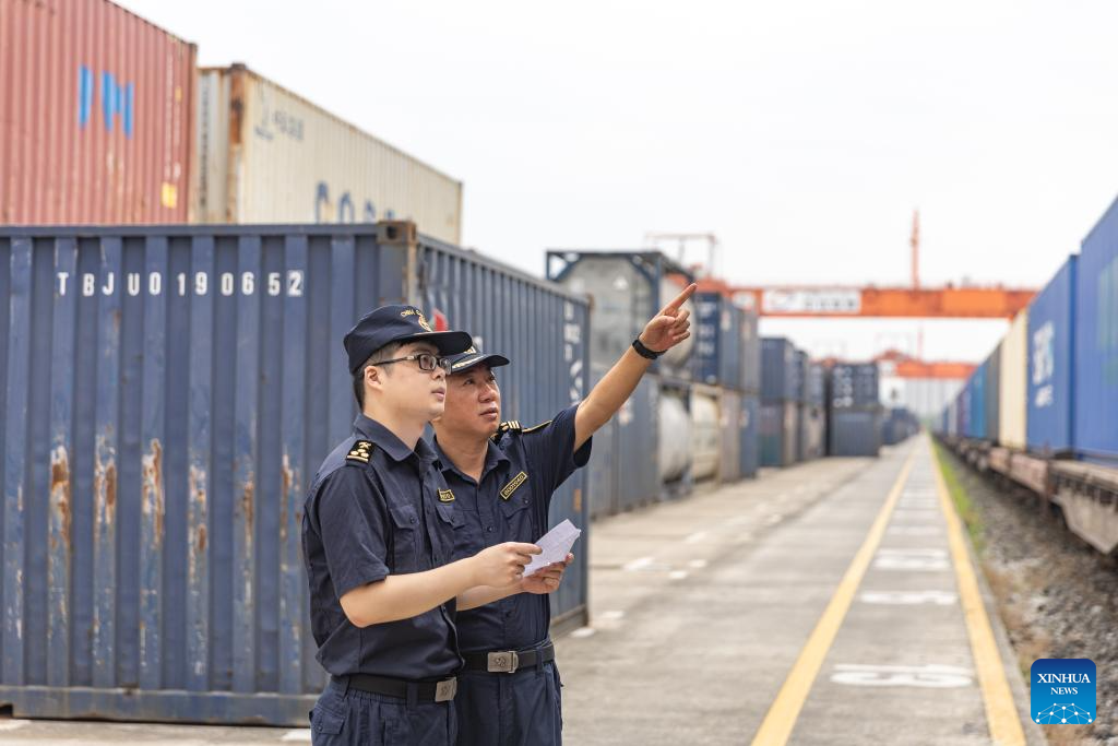 Customs staff inspect a China-Europe freight train at the Chongqing International Logistics Hub Park in Shapingba District of Chongqing, southwest China, July 30, 2024. (Xinhua/Huang Wei)