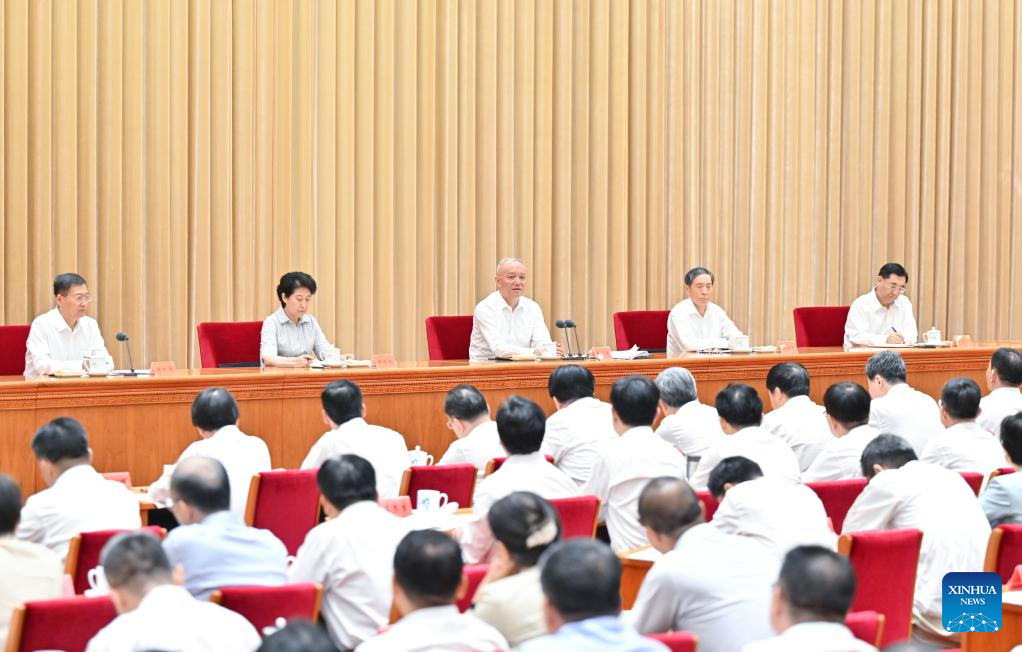 A conference is held to study and implement the guiding principles from the third plenum of the 20th Communist Party of China (CPC) Central Committee and advance Party building in central Party and state departments in Beijing, capital of China, July 31, 2024. Cai Qi, a member of the Standing Committee of the Political Bureau of the CPC Central Committee and secretary of the Working Committee for Central and State Institutions, attended the meeting, conveyed Xi Jinping's important instruction, and delivered a speech. (Xinhua/Yue Yuewei)