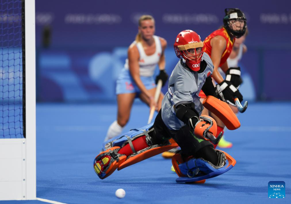 Goalkeeper Ye Jiao of China attempts to make a save during the women's pool A match of hockey between China and the Netherlands in Colombes, France, July 31, 2024. (Xinhua/Ren Pengfei)