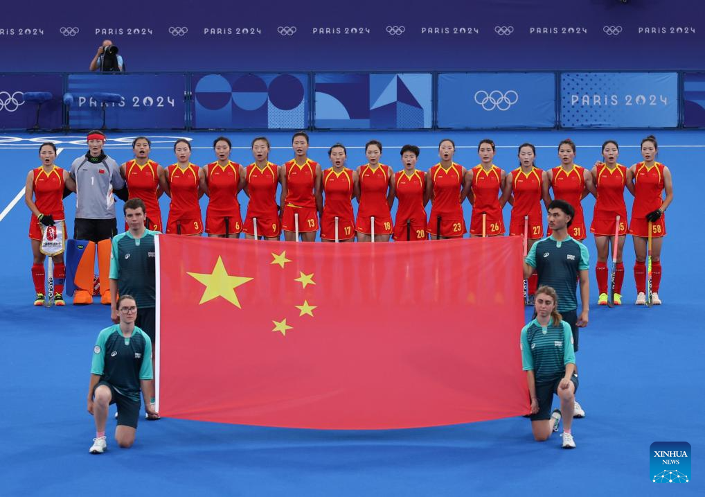 Players of China are seen prior to the women's pool A match of hockey between the Netherlands and China in Colombes, northwest suburbs of Paris, France, July 31, 2024. (Xinhua/Ren Pengfei)