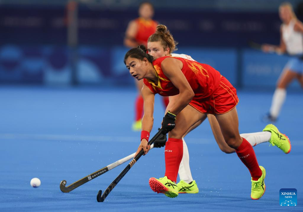 Gu Bingfeng (front) of China competes during the women's pool A match of hockey between the Netherlands and China in Colombes, northwest suburbs of Paris, France, July 31, 2024. (Xinhua/Ren Pengfei)
