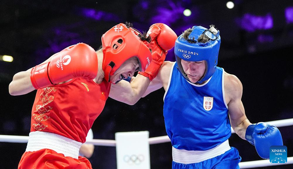 Yang Wenlu (R) of China competes against Natalia Shadrina of Serbia during the women's 60kg quarterfinal of boxing at the Paris 2024 Olympic Games in Paris, France, July 31, 2024. (Xinhua/Jiang Wenyao)